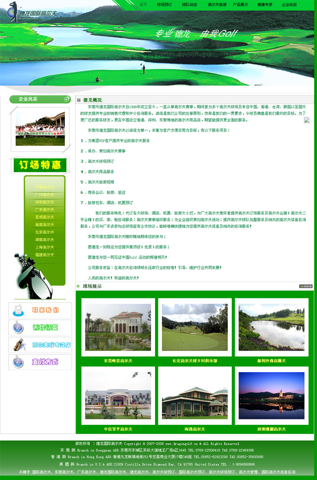 東莞市德龍國際高爾夫自1998年成立至今,一直從事高爾夫賽事,期間曾為多個高爾夫球場及來自中國、香港、臺灣、韓國以至國外的球友提供專業(yè)的銷售代理和中介咨詢服務(wù)。誠信是我們公司的處事原則,效率是我們的一貫要求,令球員滿意是我們最終的目標。為了更廣泛的服務(wù)球友,更在中國設(shè)立香港、深圳、東莞等地的高爾夫用品店,期望能提供更全面的服務(wù)。